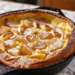 - Combine and Bake: Carefully remove the hot skillet from the oven. Spread the sautéed apples evenly in the skillet, then pour the batter over the apples. Immediately return the skillet to the oven and bake for about 20 minutes until the pancake is puffed, golden, and set in the center.