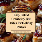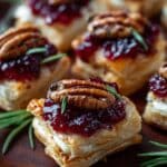 Delightfully festive and easy-to-make Baked Cranberry Brie Bites featuring creamy brie cheese wrapped in flaky puff pastry, topped with sweet cranberry sauce and optional candied pecans for crunch. Perfect as an elegant appetizer or holiday treat.