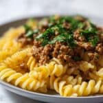 This Beef and Rotini in Garlic Parmesan Sauce is a delicious and comforting pasta dish that combines hearty ground beef with a rich, creamy sauce. The garlic and Parmesan bring bold flavors, while the rotini pasta holds onto every bit of the savory sauce perfectly.