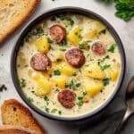 Keywords: kielbasa potato soup, sausage soup, hearty soup, comfort food, easy soup recipe, cheddar cheese soup