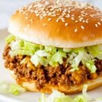 Big Mac Sloppy Joes combine the classic flavors of a Big Mac with the casual comfort of sloppy joes, featuring seasoned ground beef mixed with mayo, Thousand Island dressing, pickles, and onions, topped with cheddar cheese and shredded lettuce, all served on toasted sesame seed buns for a tasty and nostalgic sandwich experience.