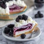 - Serve the Pie: Just before serving, whip 1 cup heavy cream to soft peaks. Remove the pie from the freezer and decorate the top with the freshly whipped cream and fresh blackberries for a beautiful and delicious finish.