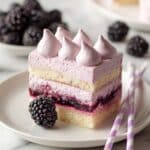 A square slice of layered dessert sits on a white plate with a fresh blackberry at its base, placed on a white marbled surface scattered with additional blackberries and purple-white striped straws. The dessert has three main layers: the bottom and middle layers consist of light yellow sponge soaked with a deep purple berry sauce, while thick layers of light pink creamy mousse with a smooth and fluffy texture fill in between and on top. Five dollops of the same pink mousse are neatly spaced on the top layer, adding height and texture to the piece. Photo taken with an iphone --ar 4:5 --v 7
