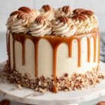 - Garnish: Decorate the sides of the cake by pressing pecan halves evenly around the edges. Drizzle any remaining caramel sauce over the top and sides of the cake, and scatter additional pecans on top for a beautiful finish.