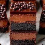 This image shows two stacked square pieces of chocolate cake on a white marbled surface. Each piece has three layers: the bottom layer is a dark, crumbly chocolate base resembling a cookie crust; the middle layer is a thick, smooth chocolate mousse with a rich, slightly textured look; the top layer is a glossy, darker chocolate ganache, decorated with small round chocolate balls that add texture and visual interest. The sides are cleanly cut, showing sharp layers, and the background includes more similar cake pieces partially visible. The overall look is moist, rich, and indulgent. photo taken with an iphone --ar 4:5 --v 7