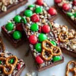 - Add Toppings: Evenly sprinkle the Christmas-themed M&Ms and crushed pretzels over the melted chocolate for a festive appearance and added crunch.
