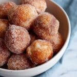 - Make sure the donut holes are still warm when coating for best adherence of the cinnamon sugar.