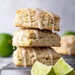 - Cool and Glaze: Let the scones cool for about 15 minutes on the rack. Meanwhile, prepare glaze by mixing icing sugar, lime juice, and lime zest in a small bowl. Drizzle the glaze evenly over the warm scones for a tangy finish.