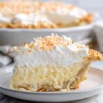 Keywords: coconut cream pie, coconut pie crust, pastry cream, whipped cream topping, toasted coconut, white chocolate curls, tropical dessert
