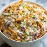The image shows a white bowl filled with a creamy salad made of many layers. The base layer has orange crunchy strips mixed with small green peas and yellow corn. Over this, there is a thick creamy layer that binds everything together, showing bits of purple onion and some small green herbs. The colors mix well, creating a textured look with crunchy and soft parts visible. The bowl is placed on a white marbled surface. photo taken with an iphone --ar 4:5 --v 7