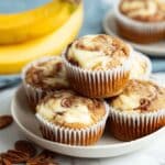 Keywords: banana muffins, cream cheese swirl, pecan muffins, breakfast muffins, easy banana recipe