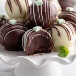 These Creamy Andes Mint Chocolate Truffles combine the rich smoothness of cream cheese with the deep flavor of semisweet chocolate and refreshing Andes mints. Coated in melted chocolate and beautifully garnished with mint pieces and green-colored white chocolate drizzle, these decadent truffles are perfect for holiday treats or special celebrations.