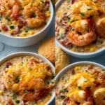 The image is a collage of four close-up photos showing a white bowl filled with a creamy, cheesy shrimp dish topped with melted yellow cheese and chopped green herbs. The dish has visible shrimp, pieces of red bell pepper, and some other colorful vegetables mixed in a creamy sauce. Each photo highlights the bubbly, golden cheese crust on top, with the shrimp sitting visibly underneath. In two photos, the bowl is placed next to golden brown biscuits on a white marbled surface. In one photo, a woman’s hand holds a biscuit near the bowl. The overall look is warm and inviting with rich textures of melted cheese, plump shrimp, and colorful vegetables. Photo taken with an iphone --ar 4:5 --v 7