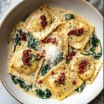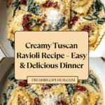 Keywords: Tuscan ravioli, creamy ravioli, cheese ravioli recipe, Italian pasta dish, sun-dried tomato sauce, spinach ravioli sauce