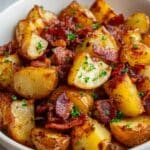 7. Roast Potatoes and Bacon: Roast in the preheated oven for 30-35 minutes, flipping the potatoes halfway through to promote even browning and crispiness.