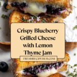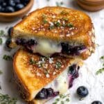 This Crispy Blueberry Grilled Cheese combines a tangy homemade blueberry lemon thyme jam with melted white cheddar and mozzarella for a unique twist on a classic comfort food. The sweet and savory flavors balance perfectly, making it a delicious treat for any time of day.