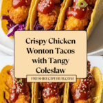 These Crispy Chicken Wonton Tacos offer a delightful fusion of Asian flavors and crunchy textures. Thinly sliced teriyaki-marinated chicken is cooked to perfection and paired with a tangy coleslaw, all wrapped in crispy fried wonton wrappers and topped with sweet chili sauce, sesame seeds, and fresh cilantro for a flavorful, bite-sized taco experience.