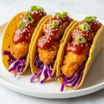 The image shows three golden, crispy taco shells standing upright on a white plate, each filled with several layers of colorful ingredients. The bottom layer inside the taco shells is shredded purple cabbage, topped with a generous amount of thick reddish-brown sauce that looks glossy and rich. Above that are pieces of tender, golden-brown fried chicken, sprinkled with sesame seeds. On top, there are small green slices of fresh green onions adding a fresh touch. The white plate sits on a white marbled surface, and the lighting brings out the crispy texture and vibrant colors clearly. Photo taken with an iphone --ar 4:5 --v 7