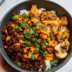 These Crispy Chile Ground Beef and Cauliflower Protein Bowls offer a flavorful, low-carb, high-protein meal featuring seasoned and crisped ground beef served atop zesty cauliflower rice. Topped with fresh vegetables and a tangy yogurt-lime drizzle, this dish is quick to prepare, vibrant in taste, and perfect for a nutritious bowl meal.