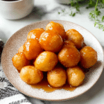 The image shows a white plate with a textured surface filled with about fifteen small golden brown fried dough balls covered in a shiny amber-colored syrup. The dough balls are clustered together in the center of the plate creating a warm and glossy look. The plate rests on a white marbled surface with a striped cloth partly visible underneath it and a white bowl with a dark liquid on the upper left side. Green herbs are blurred in the background on the right, adding freshness to the scene. Photo taken with an iphone --ar 4:5 --v 7