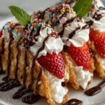 These Crispy Neapolitan Cake Tacos combine a thin, buttery cake shell with a luscious ricotta filling flavored with cinnamon, vanilla, and orange marmalade. Finished with a glossy honey-orange glaze, this dessert delivers a delightful balance of crisp texture, creamy sweetness, and bright citrus notes, perfectly resembling the classic Neapolitan flavor profile in a unique taco format.
