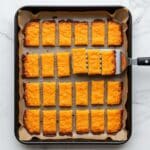- Arrange Carrots on Cheese: Place the coated carrots onto the parmesan-covered area on the pan with the cut side down, arranging them close together in a rectangular pattern without gaps to allow the cheese to crisp up around them.