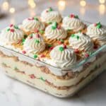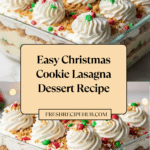 This Easy Christmas Cookie Lasagna is a festive, no-bake layered dessert perfect for the holiday season. It features layers of crushed Christmas sugar cookies mixed with butter, a creamy cheesecake layer, a rich vanilla pudding layer with a delightful crunch, and a fluffy whipped topping adorned with festive sprinkles or chocolate chips. Chill it overnight for beautiful layers and a delicious treat that’s sure to impress at any holiday gathering.