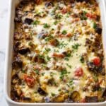 This hearty Eggplant Casserole features tender sautéed eggplant combined with a savory mix of onions, peppers, mushrooms, tomatoes, and fresh herbs, layered with Parmesan and mozzarella cheeses, then baked to golden perfection. It makes a comforting vegetarian main dish or side, packed with rich Mediterranean flavors.