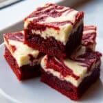 These fudgy red velvet brownies combine the rich, moist texture of classic brownies with the vibrant color and subtle chocolate flavor of red velvet. Topped with a creamy, tangy cream cheese frosting swirl, they make an indulgent treat perfect for any occasion.