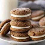 Store the assembled cookies in an airtight container at room temperature for up to 3 days. For longer storage, keep them refrigerated for up to a week. Let refrigerated cookies come to room temperature before serving for the best texture. You can also freeze the unassembled cookies and frosting separately for up to 2 months.