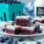 A white plate holds six square pieces of blueberry cake, each with two visible layers: a thick, moist purple cake base and a thin, smooth white icing layer on top. The top cake piece is stacked on three others forming a pyramid shape. Fresh dark blue blueberries are scattered around the plate and on the white marbled surface. In the background, a turquoise basket filled with blueberries and a white jar with faint black writing are softly blurred. The setting is bright with natural light. photo taken with an iphone --ar 4:5 --v 7