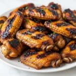 Close-up of a white plate filled with multiple pieces of crispy, grilled chicken wings. The wings have a rich dark golden-brown color with charred edges and a slightly sticky glaze, giving them a shiny and textured look. Small bits of green herbs are sprinkled lightly over the wings, adding a fresh contrast. The white marbled surface underneath the plate is bright and clean, making the warm colors of the chicken stand out. Photo taken with an iphone --ar 4:5 --v 7
