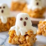 These Halloween Ghost Cornflake & Peanut Butter Cookies are a fun and festive treat that’s perfect for spooky celebrations. Crispy cornflakes coated in a smooth peanut butter caramel base are topped with marshmallow ghosts and chocolate details for an adorable finish.