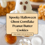 These Halloween Ghost Cornflake & Peanut Butter Cookies combine crunchy cornflakes coated in a smooth, caramel-like peanut butter mixture with spooky ghost marshmallow decorations. Perfect for a festive and fun treat, these no-bake cookies are easy to make and delightfully sweet with a touch of chocolate detailing for a hauntingly cute finish.