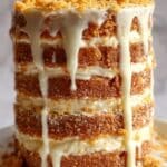 The image shows a tall cake with multiple uneven layers, around six in total, each layer is light brown with a rough texture, separated by thick white creamy frosting that drips down the sides in an irregular pattern. The cake is topped with small golden crumbs scattered over the creamy frosting. It sits on a white plate, placed on a white marbled surface. The lighting highlights the moist texture of the cake and the smoothness of the frosting. photo taken with an iphone --ar 4:5 --v 7