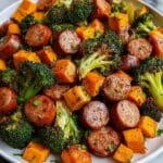 A flavorful and easy one-pan meal featuring chicken or turkey sausage roasted with sweet potatoes and broccoli, all coated in a savory honey garlic glaze. Perfect for a quick weeknight dinner with minimal cleanup.