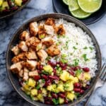A vibrant and flavorful Jerk Chicken Bowl featuring tender, spiced chicken breasts served over creamy coconut-infused brown rice, topped with a refreshing pineapple black bean salsa that adds a perfect balance of sweetness and zest.