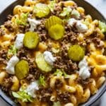 This Keto Smashburger Mac Skillet is a low-carb, high-fat dinner option that captures all the flavors of a classic smashburger in a creamy, skillet-cooked dish. Ground beef is browned and combined with onions, pickles, and tangy mustard, then blended with creamy cheeses and Greek yogurt for a rich, satisfying meal perfect for keto eaters or anyone craving a hearty, flavorful skillet dish.