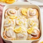 - Glaze and garnish: Once the rolls are out of the oven but still warm, drizzle the lemon cream cheese glaze evenly over them. Garnish with fresh lemon slices and additional lemon zest.