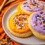 - Frost and Decorate: Using a piping bag or offset spatula, frost each cooled cookie with the colored buttercream. Top with Halloween sprinkles to finish.
