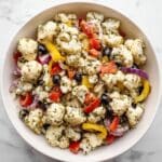 A vibrant and tangy Marinated Cauliflower Salad featuring crisp cauliflower florets, black olives, banana pepper rings, red bell pepper, and red onion, all coated in a flavorful Italian-seasoned dressing with Parmesan. This refreshing salad is perfect as a light appetizer or a healthy side dish, and its flavors deepen after marinating for at least 30 minutes.