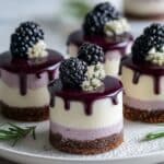 These Mini Blackberry Mousse Cakes are a delightful no-bake dessert featuring a crunchy chocolate cookie crust topped with a smooth and airy blackberry mousse, enriched with white chocolate ganache. Garnished with fresh blackberries and edible flowers, these elegant individual cakes are perfect for special occasions or a sophisticated treat.