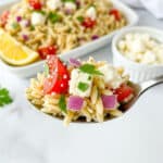 Keywords: orzo salad, lemon salad, Mediterranean salad, vegetarian pasta salad, feta cheese salad