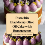 This Pistachio and Blackberry Olive Oil Cake is a moist and flavorful dessert combining finely ground pistachios and fruity blackberry preserves. Enhanced with olive oil and a hint of almond extract, this cake offers a rich yet tender crumb, layered with a luscious blackberry buttercream and garnished with fresh berries and chopped pistachios for added texture and visual appeal.