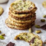 Delicious Pistachio Cookies featuring a perfect blend of ground pistachios and chocolate chunks for a nutty, sweet treat. These cookies are crisp on the edges, soft and puffy in the center, and packed with roasted salted pistachios for an extra crunch and flavor. Ideal for snacking, gifting, or pairing with your favorite hot beverage.