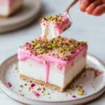 A square dessert with three visible layers sits on a white plate over a white marbled surface: the bottom layer is a solid light brown crust, the middle layer is thick and creamy white, and the top layer is a smooth, vibrant pink glaze dripping slightly down the sides. The dessert is garnished generously with chopped green pistachios and light pink sprinkles. A spoon, held by a woman's hand, scoops a piece from the top right corner, showing the creamy texture inside. photo taken with an iphone --ar 4:5 --v 7