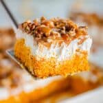 Keywords: pumpkin cake, better than sex cake, fall dessert, moist pumpkin cake, easy pumpkin dessert, no egg cake, caramel topping, Heath bits cake