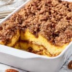 This Pumpkin French Toast Casserole is a cozy and delicious breakfast casserole perfect for fall mornings. Made with cubes of day-old French bread soaked in a pumpkin-spiced custard, topped with a crunchy pecan streusel, and baked to golden perfection, it offers a warm, comforting start to your day. Optionally, serve with maple syrup and vanilla ice cream or whipped topping for an indulgent treat.