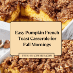 This Pumpkin French Toast Casserole is a cozy, delicious breakfast perfect for fall mornings or special occasions. Soft bread soaked in a pumpkin-spice custard and topped with a crunchy pecan streusel makes it a crowd-pleaser. Serve it warm with maple syrup and a touch of vanilla ice cream for extra comfort.