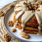 A white plate with a stack of six golden brown pancakes arranged in a circle on a white marbled surface. The pancakes are thick and fluffy, with a smooth and shiny brown surface. A thick beige sauce with specks of cinnamon or spice is drizzled generously over the pancakes in swirling, uneven lines, some sauce pooling slightly around the base. Around the plate, scattered walnut halves rest on the white marbled surface, adding a rustic touch. The plate sits on a beige woven placemat that goes partly out of shot, adding texture to the image. Photo taken with an iphone --ar 4:5 --v 7